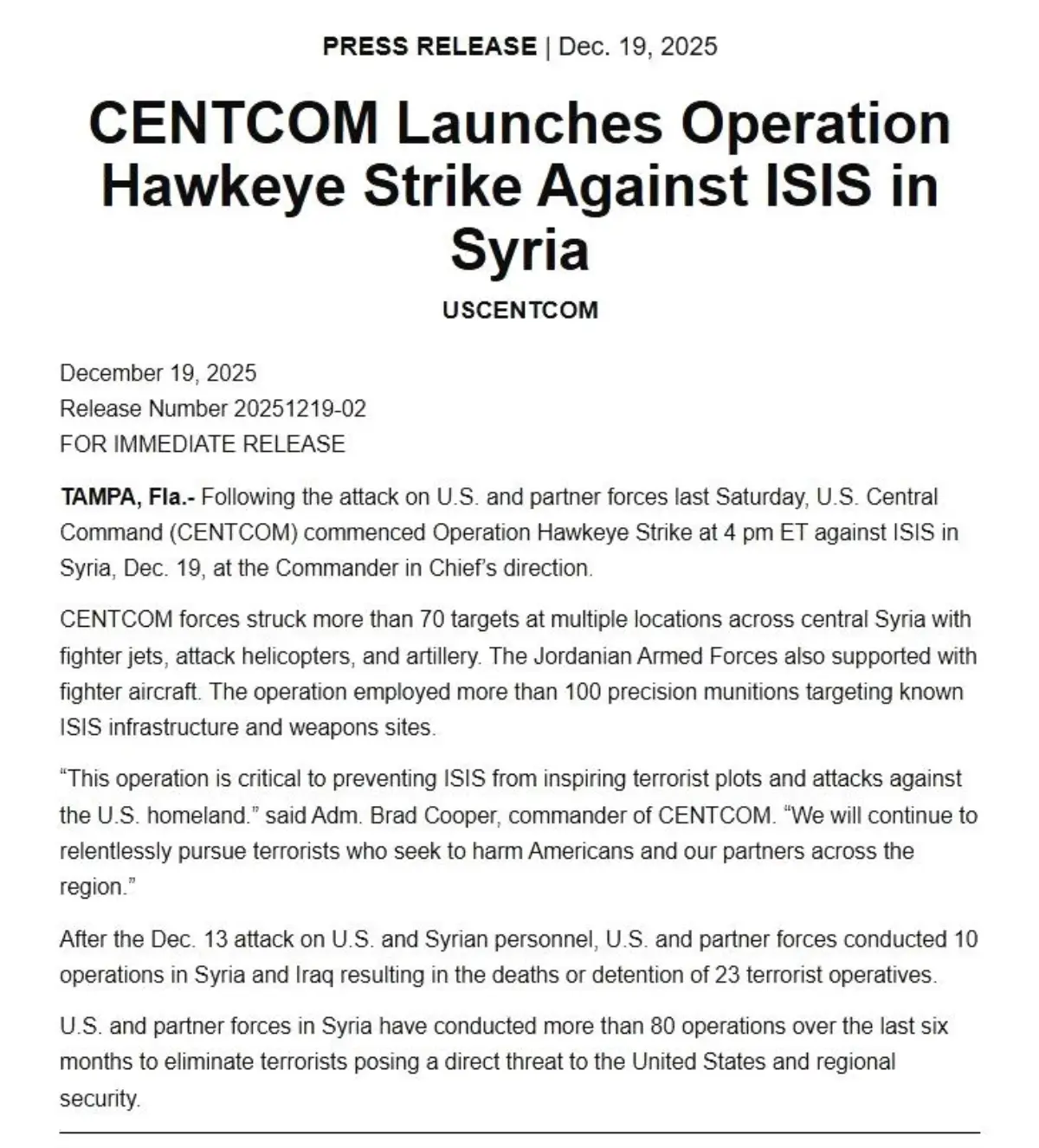 ABD Merkez Kuvvetler Komutanlığı (CENTCOM), Suriye’nin Tedmur (Palmira) bölgesinde gerçekleşen ölümcül DEAŞ saldırısının ardından, Donald Trump’ın talimatıyla Hawkeye Operasyonu (Şahin Gözü Operasyonu) adlı geniş çaplı bir misilleme harekâtı başlattı. Operasyon, DEAŞ’ın altyapı, silah depoları ve lojistik üslerini yok etmeyi hedef alıyor.