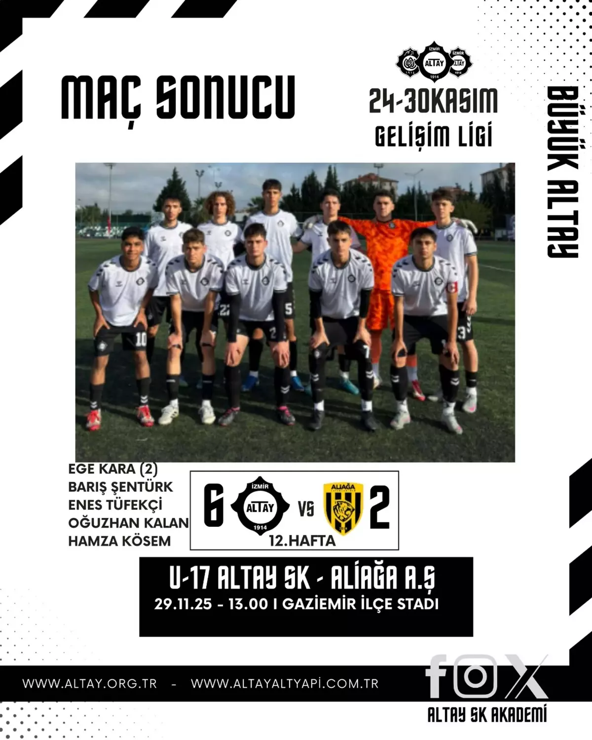 Altay’ın U16 ekibi, alt sıralardan kurtulma mücadelesinde Aliağa Futbolu 2-0 yenerek moral topladı. Defans hattındaki genç oyuncuların disiplinli savunması, maçın en çok konuşulan anlarından biriydi.