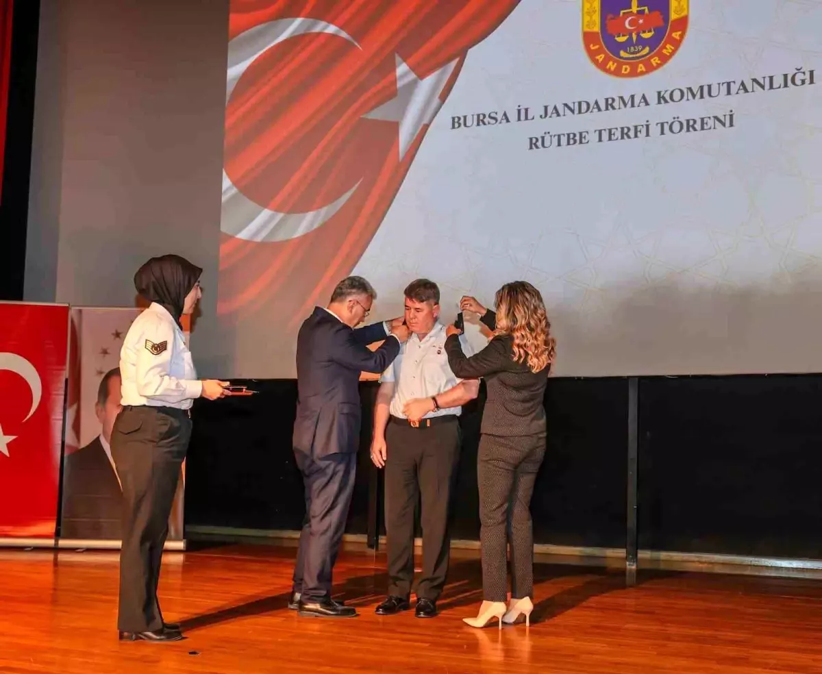 Bursa İl Jandarma Komutanlığı'nda görev yapan jandarma personeli, rütbe terfi töreniyle bir üst rütbeye yükseltildi. Törene Vali Erol Ayyıldız, il protokolü ve personelin aileleri katıldı. Uludağ Üniversitesi Prof. Dr. Mete Cengiz Kültür Merkezi'nde düzenlenen etkinlikte, personelin yeni rütbeleri takdim edildi.