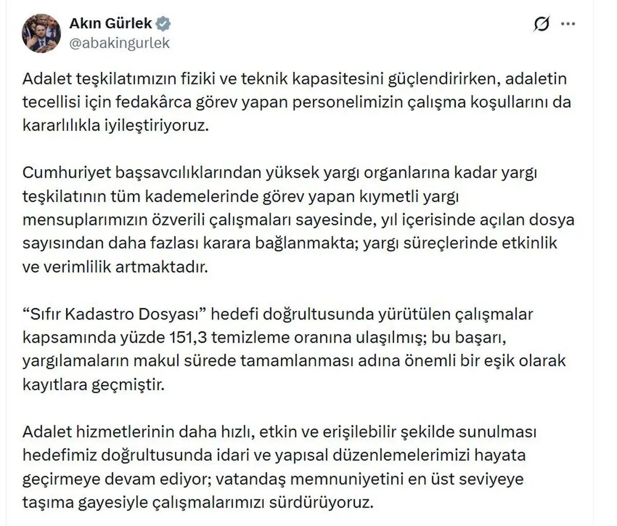 Adalet Bakanı Akın Gürlek, Cumhuriyet başsavcılıklarından yüksek yargı organlarına kadar yargı teşkilatının tüm kademelerinde görev yapan yargı mensuplarının özverili çalışmaları sayesinde yargı süreçlerinde önemli bir verimlilik artışı yaşandığını ifade etti.