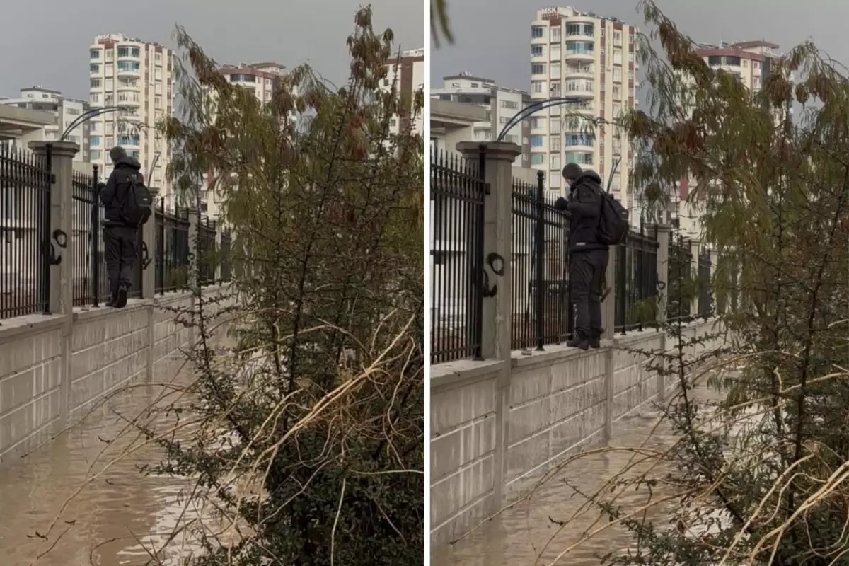 Yoğun sağanak yağışların etkisiyle Adana’da yollar sular altında kaldı. Kaldırımı kaybolan bir vatandaş, hastane duvarına tırmanarak karşıya geçti. Görüntüler kameralara yansıdı.