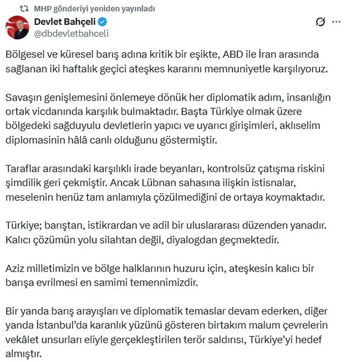 MHP Genel Başkanı Devlet Bahçeli, ABD ile İran arasında sağlanan iki haftalık geçici ateşkes kararını memnuniyetle karşıladığını ve bu sürecin kalıcı barışa dönüşmesini temenni etti. Türkiye'nin barış ve istikrar konusundaki kararlılığı da vurgulandı.