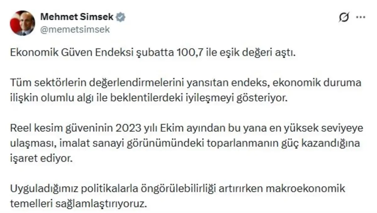 Maliye Bakanı Mehmet Şimşek, Türkiye’nin ekonomik güven endeksinin Şubat ayı verileriyle 100,7 seviyesine çıktığını resmi açıklamalarıyla bildirdi. Bu artış, son dönemdeki olumlu ekonomik gelişmelerin bir göstergesi olarak yorumlanıyor.