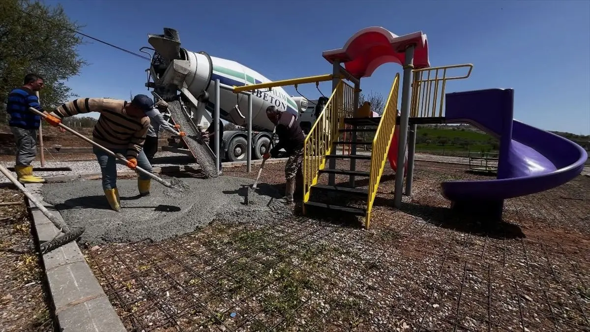 Ağın’da çocuk parkının zemini yenileniyor; güvenli oyun alanı oluşturmak için beton dökülüyor.