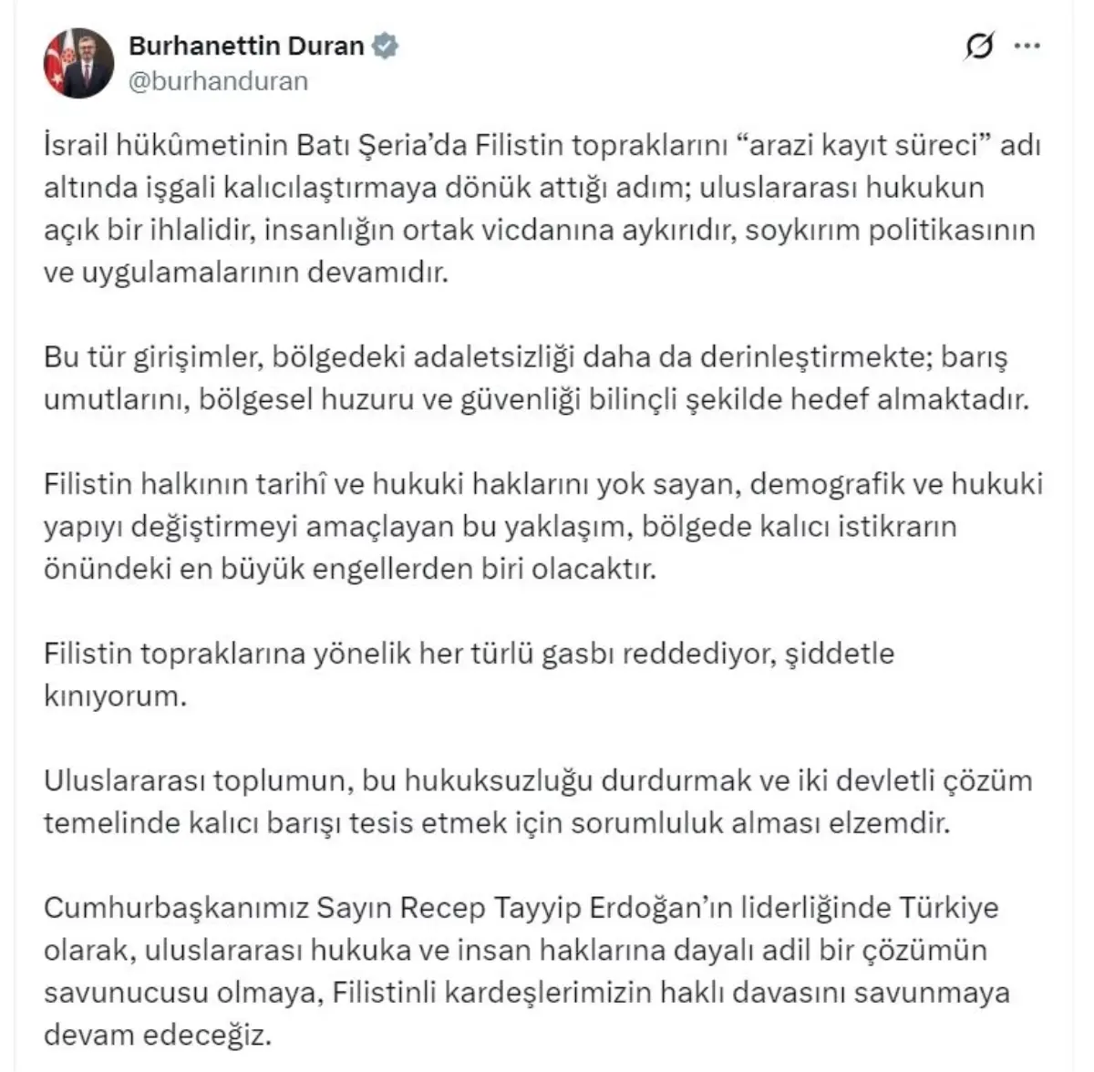 İletişim Başkanı Burhanettin Duran, İsrail'in Batı Şeria'da “araç kayıt süreci” adı altında yürüttüğü arazi işgali girişimini kalıcılaştırma çabalarını kınadı.