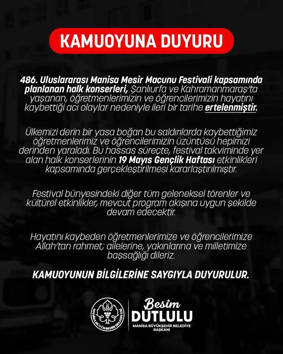 Şanlıurfa ve Kahramanmaraş’taki son saldırıların etkisiyle, Manisa’da gerçekleşecek olan Mesir Festivali konserleri yeni bir tarihe alındı; diğer kültür etkinlikleri planlandığı gibi devam edecek.