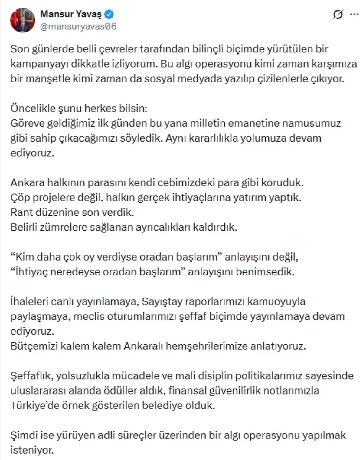 Ankara Büyükşehir Belediye Başkanı Mansur Yavaş, şeffaf yönetim ilkesini ve halkın desteğini ön plana çıkararak algı operasyonlarına karşı durdu.