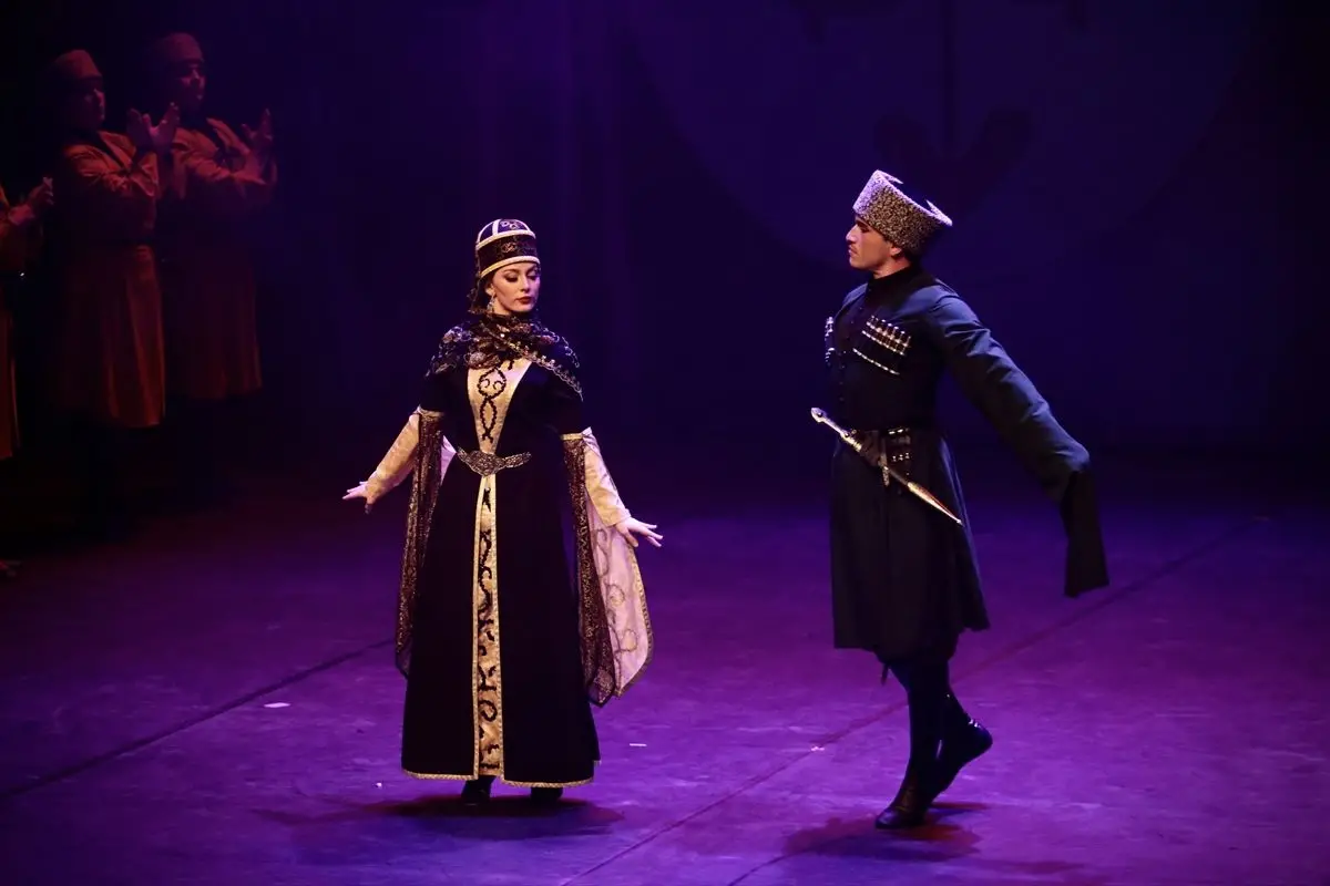 “Nartlar” adı verilen kahraman figürler, güçlü ve akıcı hareketlerle Çerkezlerin direniş ruhunu temsil ediyor.