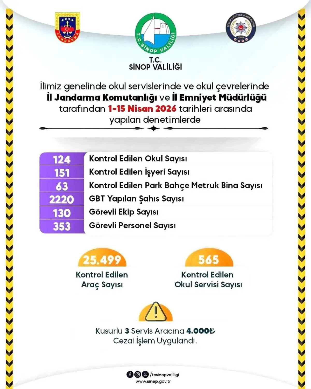 Sinop’taki okul servisleri ve çevrelerinde kapsamlı güvenlik denetimleri gerçekleştirildi; toplam 353 personel bu denetimlerde görev aldı.