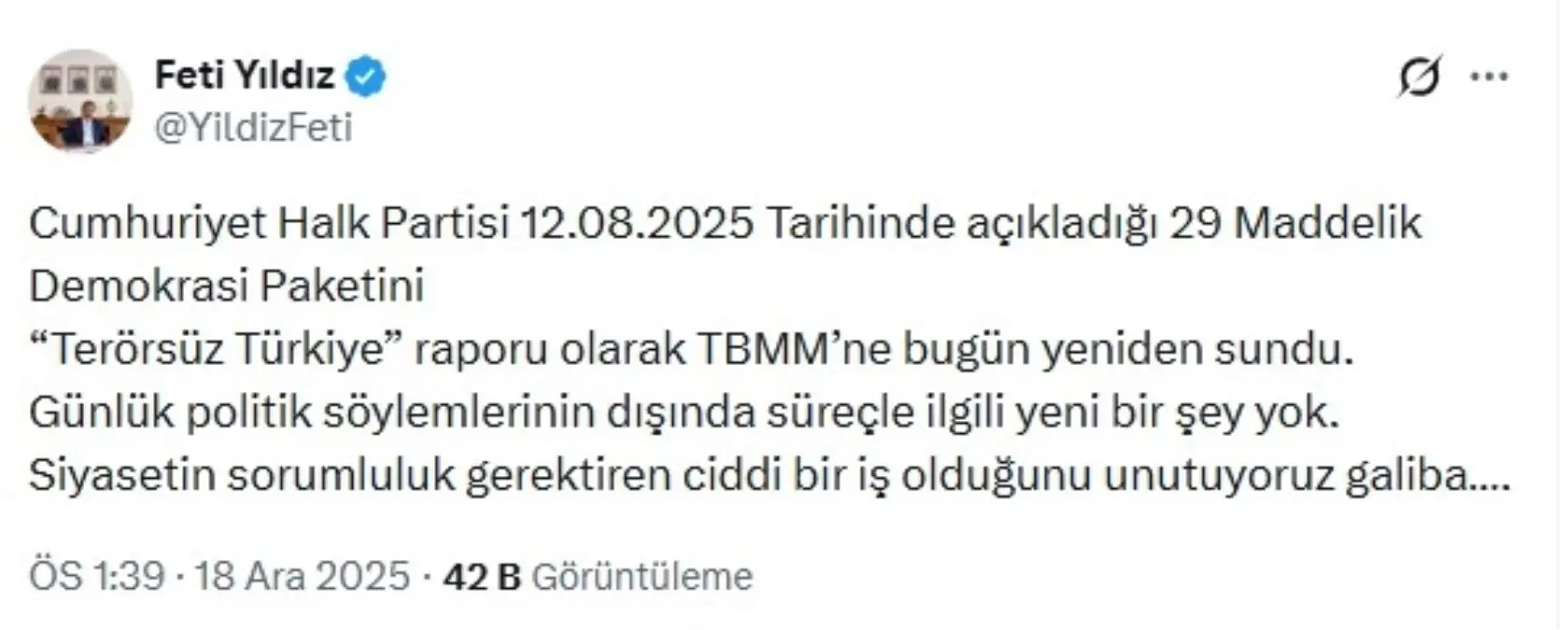 Feti Yıldız, sosyal medya hesabından yaptığı paylaşımda Cumhuriyet Halk Partisi’nin (CHP) 12 Ağustos 2025 tarihinde yayımladığı 29 maddelik “Demokrasi Paketi”ni “Terörsüz Türkiye” raporu olarak TBMM’ye yeniden sunduğunu duyurdu. Yıldız, bu sunumu “Günlük politik söylemlerinin dışında süreçle ilgili yeni bir şey yok” şeklinde nitelendirerek eleştirdi.