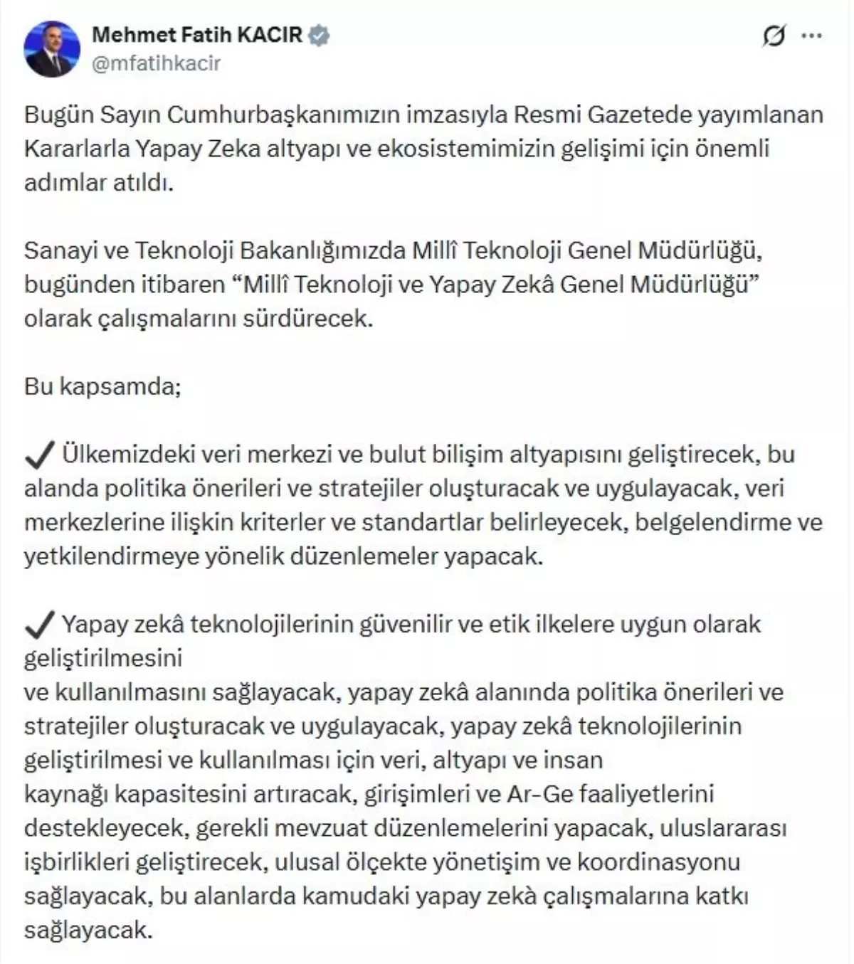 Sanayi ve Teknoloji Bakanı Mehmet Fatih Kacır, resmi sosyal medya hesabından yaptığı açıklamada, Cumhurbaşkanı Recep Tayyip Erdoğan’ın imzasıyla Resmi Gazete’de yayımlanan kararların ardından Türkiye’nin yapay zeka altyapısı ve ekosisteminin hızla güçleneceğini belirtti. Bakan Kacır, “Milli Teknoloji Genel Müdürlüğü artık ‘Milli Teknoloji ve Yapay Zeka Genel Müdürlüğü’ olarak çalışacak ve bu çerçevede veri merkezi, bulut bilişim, etik AI, mevzuat ve uluslararası iş birliği gibi kritik alanlarda kapsamlı politikalar geliştirecek” ifadelerini kullandı.
